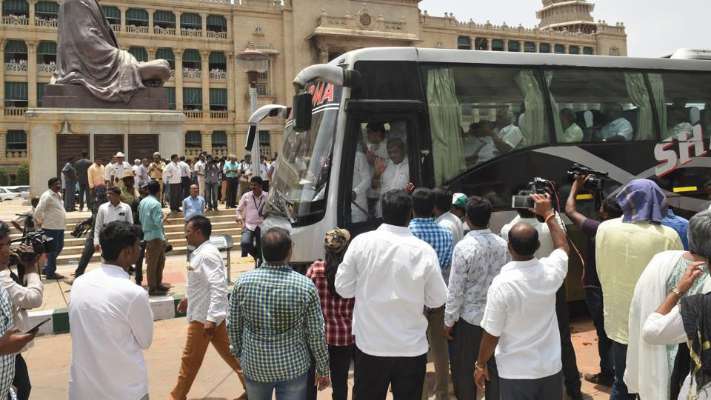 കോണ്ഗ്രസിന്റെ രണ്ട് എം.എല്.എമാര് കൂട്ടത്തിലില്ല എന്നും റിപ്പോര്ട്ടുകളുണ്ട്. ആനന്ദ് സിങ്, പ്രതാപ് ഗൗഡ പാട്ടീല് എന്നിവരാണ് കോണ്ഗ്രസ് കൂട്ടത്തിലില്ലാത്തത്. മറ്റെല്ലാ എം.എല്.എമാരും ബസിലുണ്ടെന്നാണ് വിവരം.