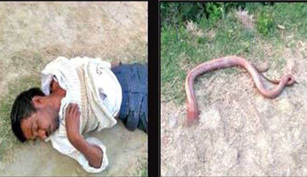 ലഖ്നൗ: വെറുതെ ഇരിക്കുന്ന തന്നെ വന്ന് കടിച്ച പാമ്പിനോട് യുവാവ് ചെയ്ത പ്രതികാരം കണ്ടോ! തന്നെ കടിച്ച പാമ്പിനെ തിരിച്ച് കടിച്ചാണ് യുവാവ് പ്രതികാരം ചെയ്തത്. സോനെലാല് എന്ന യുവാവാണ് തന്നെ കടിച്ച പാമ്പിനെ തലകടിച്ചെടുത്ത് ച്യൂയിംഗം പോലെ ചവച്ചരച്ച് ദേഷ്യം തീര്ത്തത്.