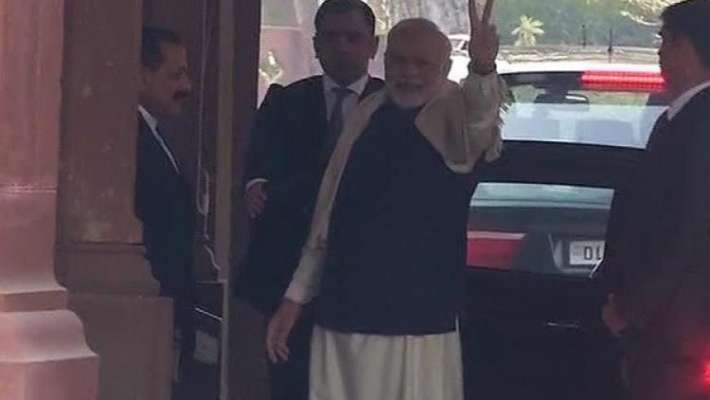 പാര്ലമെന്റ് സമ്മേളനത്തിനെത്തിയ മോദി കാറില് നിന്നിറങ്ങിയ ഉടനെ മാധ്യമപ്രവര്ത്തകരോട് നമസ്തേ പറഞ്ഞതിന് ശേഷമാണ് വിജയചിഹ്നം ഉയര്ത്തിക്കാണിച്ചത്.