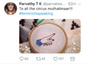 ജൂഡിന്റെ പരാമര്ശത്തില് ശക്തമായ വാഗ്വാദങ്ങള് നടക്കുമ്പോഴാണ് അദ്ദേഹത്തിന് ചുട്ട മറുപടിയുമായി പാര്വ്വതി തന്നെ രംഗത്ത് എത്തിയത്. വിരല് ചൂണ്ടി, OMKV (ഓട് മലരെ കണ്ടംവഴി) എന്ന ട്രോള് വാക്കുകള് എമ്പ്രോയിഡറി ചെയ്ത ഒരു ചിത്രമാണ് പാര്വതി ട്വിറ്ററില് പോസ്റ്റ് ചെയ്തത്. എല്ലാ സര്ക്കസ് മുതലാളിമാര്ക്കും എന്ന കുറിപ്പോടെയും ഫെമിനിച്ചി സ്പീക്കിങ് എന്ന ടാഗോടുകൂടിയാണ് പാര്വതി ഈ ട്വീറ്റ് പോസ്റ്റ് ചെയ്തത്.