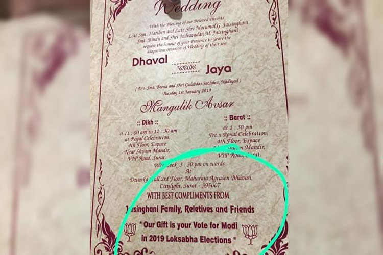 സൂററ്റ്: നരേന്ദ്രമോദിക്ക് വോട്ട് ചോദിച്ചുള്ള വിവാഹക്ഷണക്കത്ത് സോഷ്യല് മീഡിയായില് വൈറലാകുന്നു. വിവാഹത്തിന് എത്തുന്നവര് സമ്മാനങ്ങള് നല്കേണ്ടന്നും പകരം 2019 ലെ ലോകസഭ തെരഞ്ഞെടുപ്പില് മോദിക്ക് വോട്ട് ചെയ്യൂ എന്നുമാണ് ക്ഷണക്കത്തിലുള്ളത്.